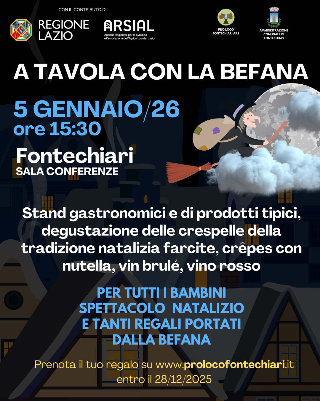 Il 5 gennaio 2026, alle ore 15:30, la magia della Befana arriva a Fontechiari โ Sala Conferenze per un pomeriggio ricco di gusto, tradizione e divertimento.