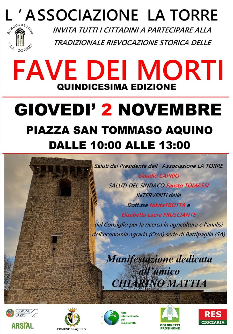 Giovedì 2 Novembre 2023 ad Aquino (Fr) in piazza San Tommaso dalle ore 10:00 alle ore 13:00 quindicesima edizione del tradizionale rievocazione storica del “Le Fave dei Morti”.