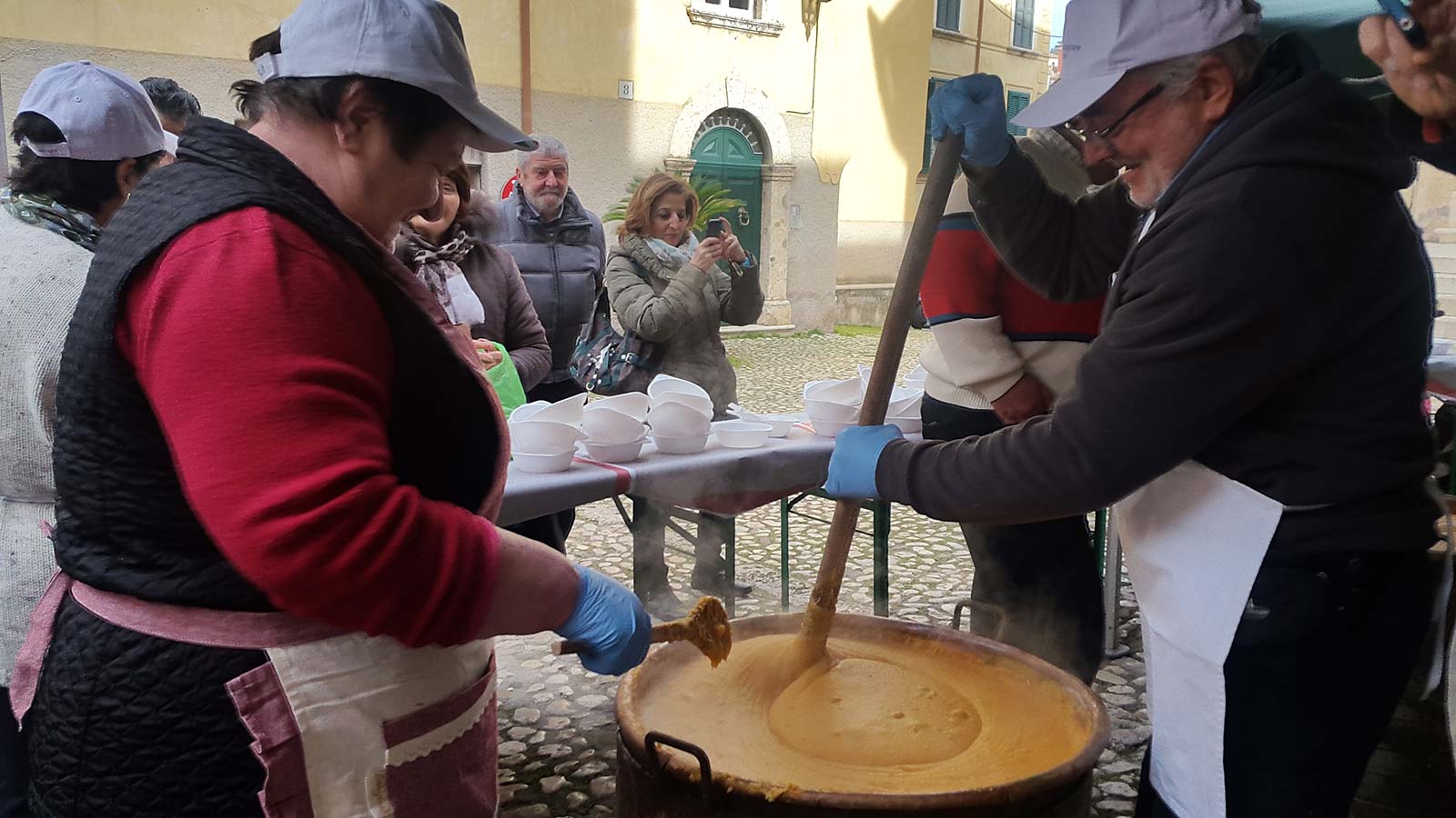 La polenta viene cucinata ad Arpino in piazza, davanti la Chiesa di Santa Maria Assunta, da cuochi improvvisati, in grandi paioli di rame (le “cuttrelle“), ben condita con sugo e pecorino grattugiato e distribuita agli astanti. Dopo aver celebrato la Santa Messa, il sacerdote benedice la polenta. Un quadro che raffigura Pompeo Grimaldi.