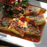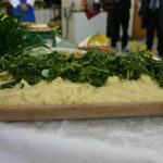 Condimento – Fare imbiondire nell'olio l'aglio, aggiungere le frattaglie tagliate a pezzetti, aggiungere il sedano e dopo qualche minuto unire il vino e fare evaporare. Condire con sale, pepe e peperoncino secondo il proprio gusto, aggiungere un bicchiere d'acqua, e cuocere a fuoco lento fintanto che l'acqua non sia evaporata, unire quindi la passata di pomodoro e cuocere ancora per mezz'ora. Stendere la polenta bollente sopra una spianatoia di legno allargandola in modo che risulti spessa circa 1 cm., condire con la salsa preparata e cospargere con una manciata di pecorino.